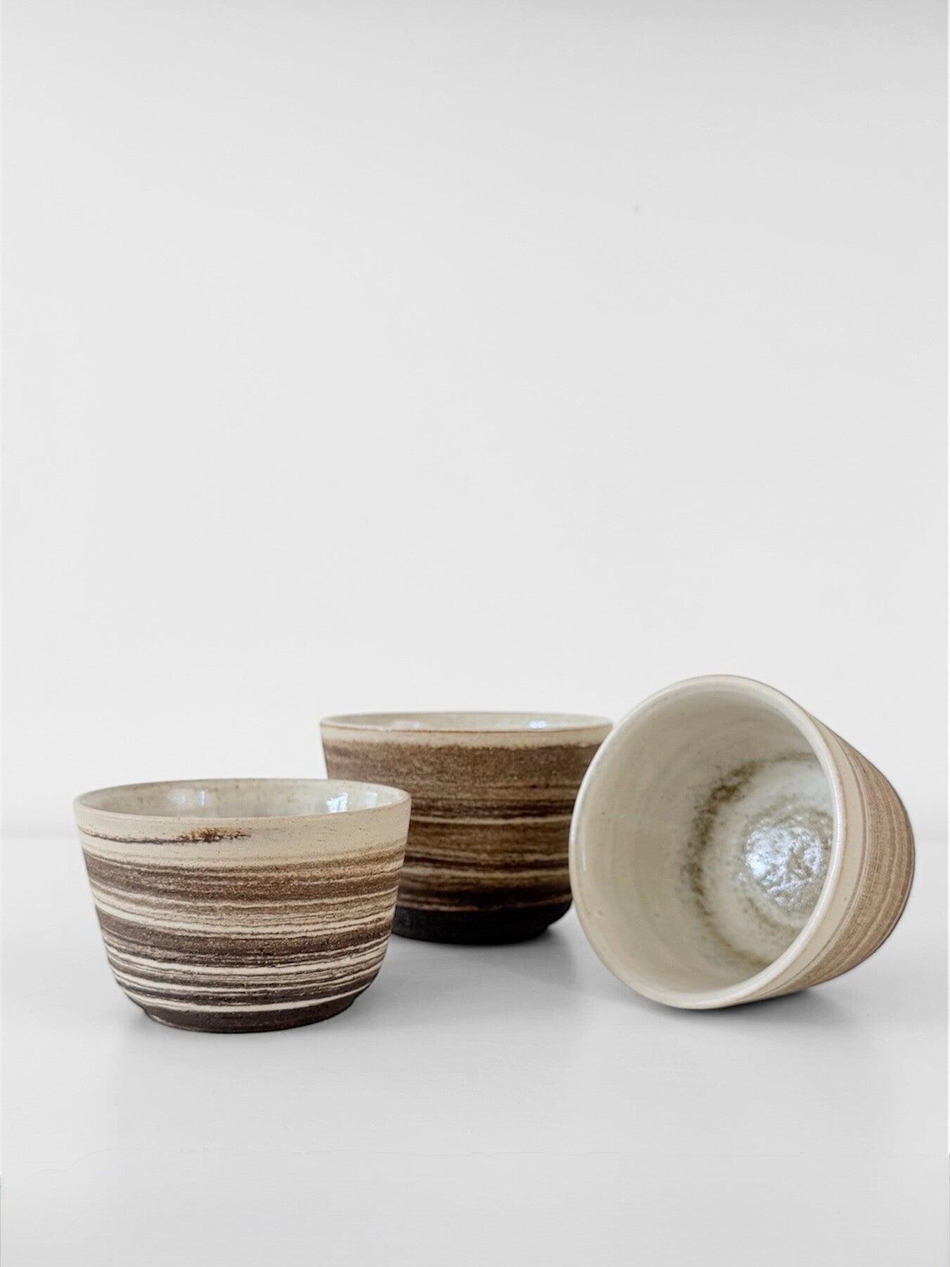 Kopjes gedraaid met 2 soorten klei, in twee maten, binnenkant geglazuurd.